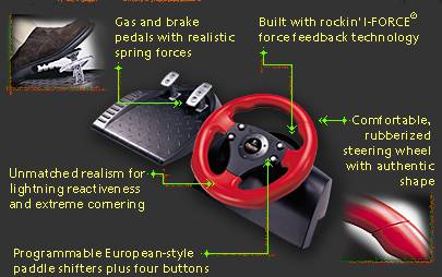 Specifications:. Type: Wheel Controller. Interface: USB. Grips: Rubber. Customizable: Wheel, paddle shifters, and four programmable buttons; double the number of buttons with the shift-button. USB: 2.0 Description: With Logitech's WingMan Formula Force GP Wheel with Pedals, you can truly be the ultimate game racer that you?ve always wanted to be. The force-feedback-equipped wheel allows you to experience steering on a real racetrack: you can feel the road, every bump, and every crash.